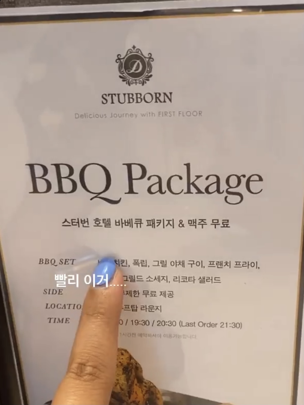 스터번 호텔에 바비큐 패키지는 예약을 해야만 먹을 수 있고 예약은 체크인할 때 카운터에서 직접 하시면 돼요. 혹은 한 시간 전에는 꼭 예약을 하셔야 이용이 가능해요!